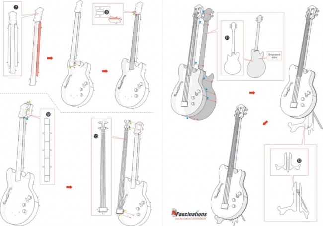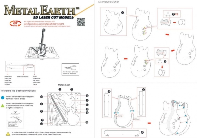 Az egyes darabokat vegye ki a fém lapokból; szükség esetén használjon kis oldalcsípő fogót (nem tartozék). Az elemek a rögzítőfül (kampó) és a nyílás által alkotott zárakkal kapcsolódnak egymáshoz. A fület kis, vékony fogóval (nem tartozék) hajlítsa meg, és fokozatosan illessze össze az összes zárat, míg egy rendkívül valósághű mestermű készül!