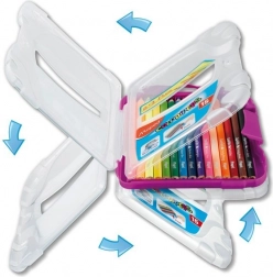 Az okos műanyag tok karos mechanizmussal megkönnyíti a rendszerezést és a gyors színválasztást. A készlet ideális az iskolába, szakkörökre és otthonra is – minden szükséges eszköz mindig kéznél.