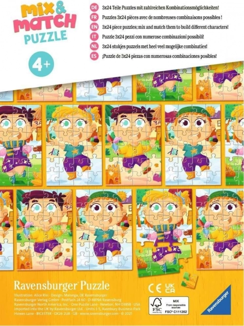 Fedezd fel a szórakoztató kirakást a Mix & Match sorozattal, ahol a fantáziának semmi sem szab határt. Egy dobozban három minőségi, 24 darabos puzzle-t találsz, amelyeket kirakhatsz a képek szerint, vagy tetszés szerint keverheted őket, és új, vicces figurákat alkothatsz színes ruhákban.