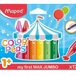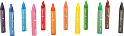 Biztonságos viaszkréták 1 éves kortól gyermekeknek, 12 színű készletben. JUMBO háromszög alakú, Ø 13 mm a helyes fogásért, papírborítás a kéz koszolódása ellen, intenzív színek és lágy rajzolás, nem mérgező.