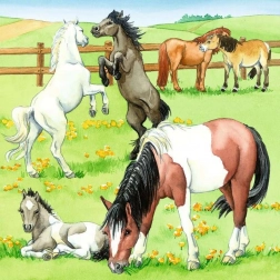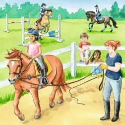 A gyerekek három különböző jelenetet rakhatnak ki – kísérettel való lovaglást, nyugodt legelőt és a lovak gondozását az istállóban. Minden motívum új kihívást és örömet nyújt a kirakózás során.