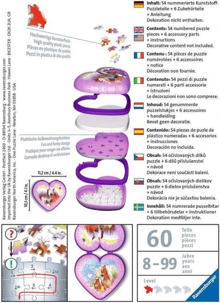 Fedezze fel a RAVENSBURGER 3D puzzle varázsát: a precízen gyártott, ívelt és hajlítható elemekből lenyűgöző, szív alakú ékszerdobozt állíthat össze finom ló motívummal. A szerkezet stabil, ragasztó nélkül is erősen tart, és az összerakás után funkcionális, gyönyörű dísze lesz a gyerekszobának.