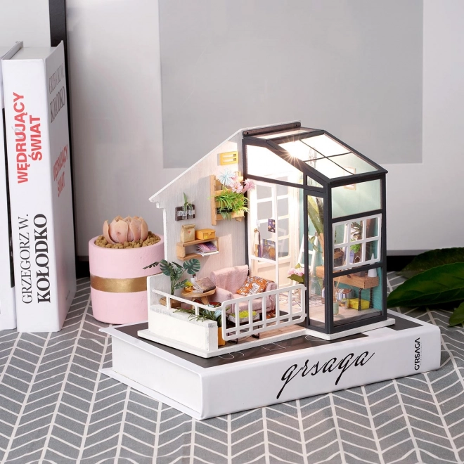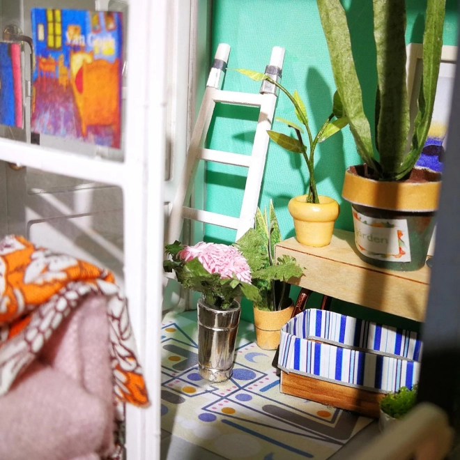 A Robotime-Rolife DGM05 készlet egy gyönyörű ház erkéllyel. Képzeld el, hogy egy otthonos kanapén ülsz a meleg nap alatt, és könyvet olvasol egy csésze kávéval. Milyen élő kép!