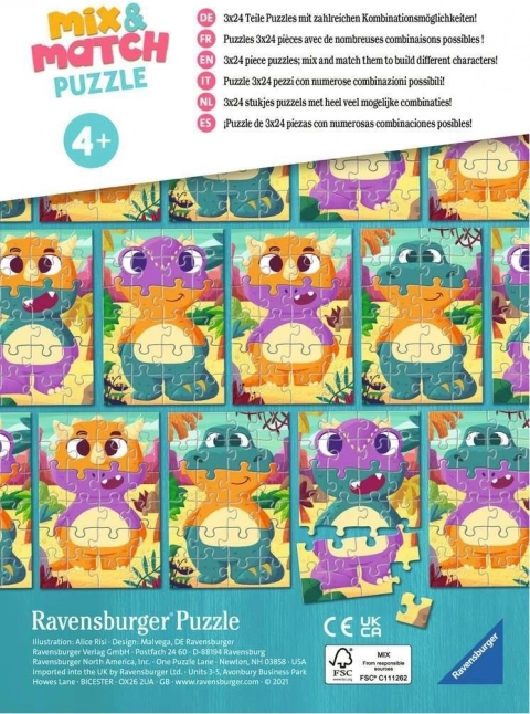 Fedezd fel a szórakozást a RAVENSBURGER Mix & Match: aranyos dinoszauruszok kirakóval, 3 darab 24 részes puzzle csomagban. A gyerekek kirakhatják a minták szerint, vagy keverhetik és kombinálhatják a darabokat a három kép között, így vicces dinoszaurusz figurákat alkothatnak. A minőségi kivitel és a könnyen megfogható elemek örömet szereznek a kis építőknek.