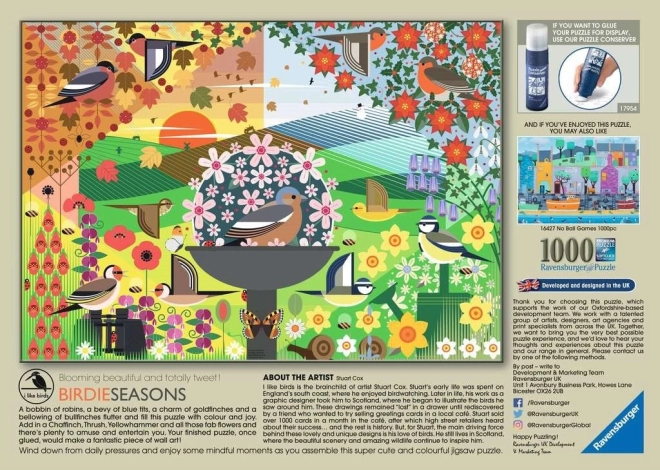 A Ravensburger 'I Like Birds – Birdie Seasons' egy csodás 1000 darabos puzzle, amely egy darabka természetet hoz az otthonába. Az illusztráció olyan madárfajokat tartalmaz mint a csicsörke, rigó, nádi lepke és cinege, amelyek szezonális virágokkal vannak kiemelve. Ez a művészi darab Stuart Cox munkája, aki ismert a természet iránti szenvedélyéről és a részletes dizájnjáról.