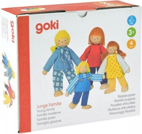 A „fiatal család” készlet anya-, apa-, lány- és fiúfigurát tartalmaz. A fa testekben lévő hajlékony drót természetes pózolást tesz lehetővé – a gyerekek könnyen eljátszhatják a mindennapi helyzeteket és saját történeteiket. A 10–12 cm-es méretnek köszönhetően a figurák kiválóan illenek a szokásos babaházakhoz, különösen a GOKI márka modelljeihez.