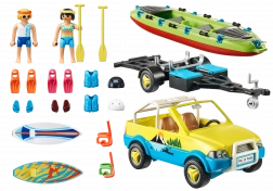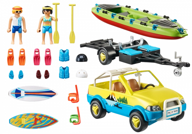 A PLAYMOBIL FAMILY FUN strandautó csónakszállító utánfutóval készlet a nyári tevékenységek színes világát hozza el – a szörfösök hullámaitól a nyugodt kenuzásig. A szörftartókkal felszerelt, masszív autó és a csónakszállító utánfutó számos játékszcenáriót kínál, és könnyedén helytáll minden vízparti kiránduláson.