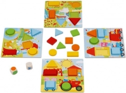 4 kép, 24 színes forma, 2 dobókocka, játékszabályok