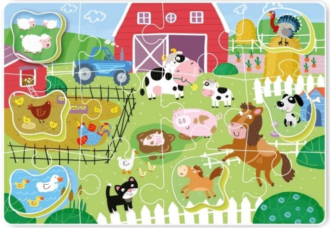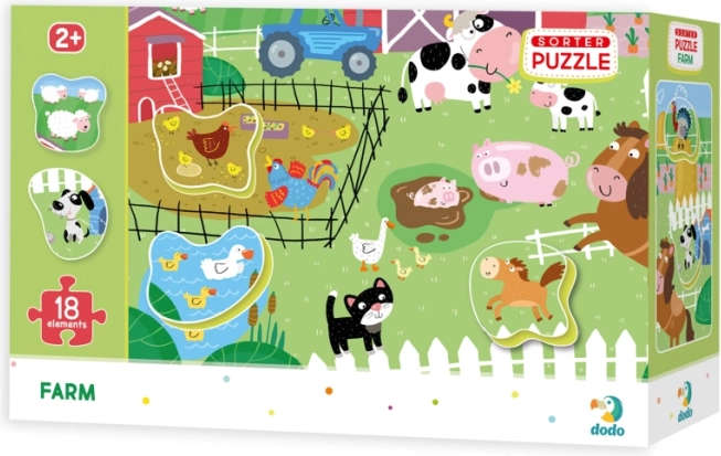 18 darabos Puzzle Farma ideális oktatójáték a legkisebb gyerekek számára. Támogatja a koncentrációt, a türelmet és fejleszti a kézügyességet, ami kiváló módja a szabadidő eltöltésének.