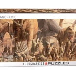 Élvezze az útját a dinoszauruszok világába ezzel a részletesen kidolgozott panorámaképrejtvénnyel. Ideális dinoszaurusz rajongók és kirakós szerelmeseinek.