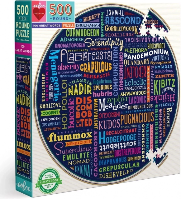 Fedezze fel a 100 szót, amelyek nemcsak szórakoztatnak, hanem tanítanak is. Ez a különleges, kerek alakú puzzle bevezet a nyelvi játékok világába, amelyek összeállítás után gyönyörű dekorációvá válnak a szobájában.