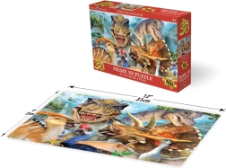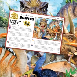 Szórakoztató 3D puzzle dinoszaurusz szelfi motívummal, amely a kis és nagy őskor-rajongóknak egyaránt örömet szerez. A 3D optikai effektusnak köszönhetően a kép térhatású és plasztikus, így egyes elemek közelebbinek, mások távolibbnak tűnnek. A kirakó 100 darabot tartalmaz, és összeállítva kb. 31 × 23 cm méretű.