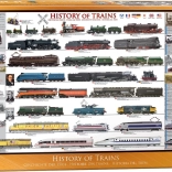 Puzzle, amely a vonatok fejlődését ábrázolja, például Class 4000 - Big Boy, Class A4, Class 373, Class 91 és N700. Minden egyes mozdonyhoz meg van adva a jelölése, a hajtás típusa, az ország, ahonnan származik, a vasúttársaság és a gyártás éve. Néhányhoz további adatok is tartoznak, mint például a hossz vagy a maximális sebesség. Oldalt egy idővonal mutatja a vasút történetét, három portréval (Richard Trevithick, George Stephenson, Robert Stephenson). A feliratok angol nyelvűek.