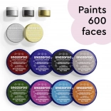 - A készlet tartalma: - fehér és élénk sárga szín (2 x 30 ml), 8 arcfesték (8 x 18 ml), 3 csillámos gél (3 x 12 ml), 10 szivacs, 3 ecset (finom kerek, multifunkcionális, lapos), képes útmutató (angol nyelvű), mosható doboz.