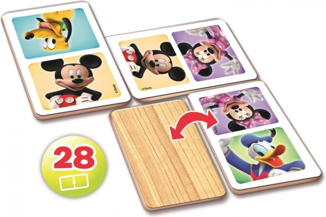 Szórakoztató fa dominójáték gyerekeknek színes képekkel a kedvenc hősökről, Mickey egérről és Minnie-ről. Ideális a gyerekek ügyességének fejlesztésére és a természetes anyagokkal való érintkezés örömére.