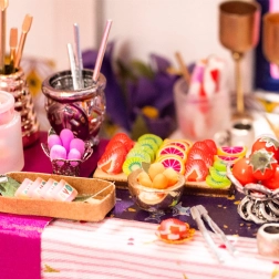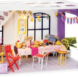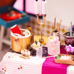 A miniatűr részletes elemeket tartalmaz, mint például színes székek, asztalok és más dekorációk, melyek hűen tükrözik a valós környezetet.
