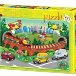 Szerezzen örömet a gyerekeknek ezzel a színes, közlekedés témájú puzzle-lel. Az autókat, buszokat és más járműveket ábrázoló kép szórakoztat, miközben fejleszti a készségeket. Az 50 darabnak köszönhetően a kirakás megfelelő kihívást jelent, kezdő kis kirakóknak is alkalmas.