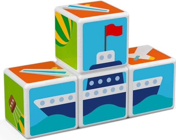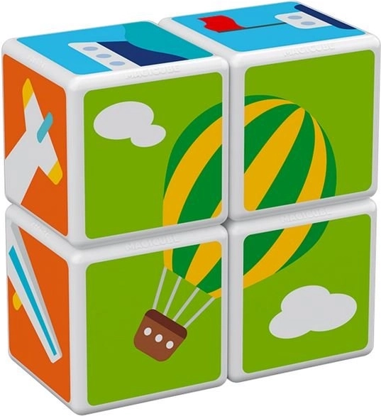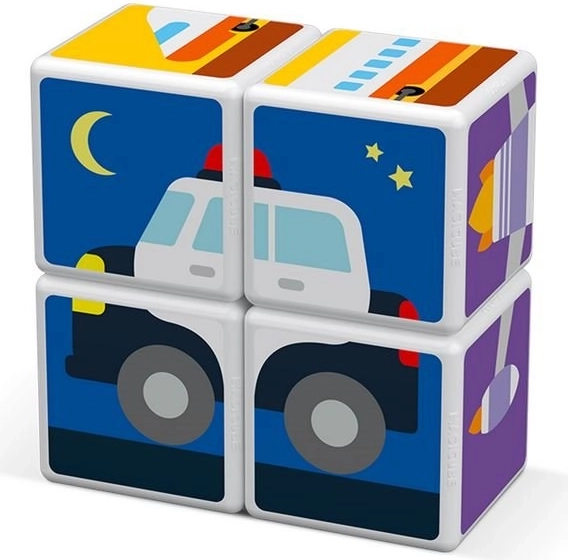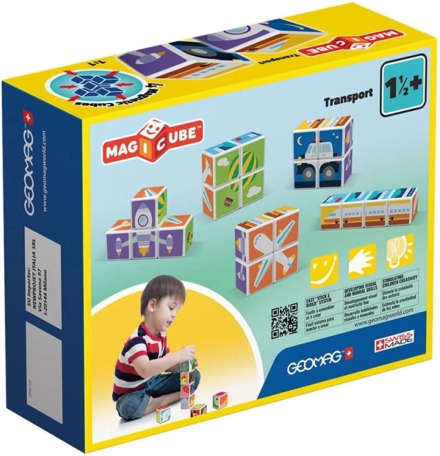 A GEOMAG Magicube Printed Transport okos mágneses építőkészlet, amely ötvözi a játékot és a tanulást. Négy, közlekedési motívumokkal nyomtatott kocka és három kétoldalas kártya hívja a gyerekeket autók, repülők, rakéták és más képek kirakására. A minden élén működő mágneseknek köszönhetően az építés intuitív és biztonságos.