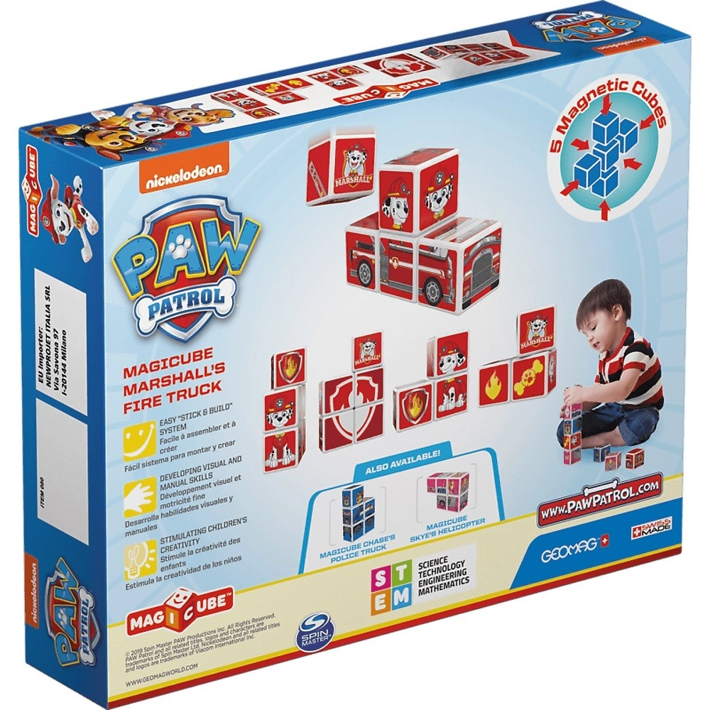 A Geomag Magicube mágneses kockakészlet MARSHALL-lal, a Mancs őrjáratból, intuitív építési élményt nyújt a gyerekeknek. Minden kocka a mágneseknek köszönhetően bármelyik oldalával kapcsolódik, így az építés egyszerű, stabil és szórakoztató. A telt színek és motívumok, mint Marshall, a tűzoltóautó, a lángpajzs és a mancsos kocka képkirakásra és 3D modellek alkotására hívnak.