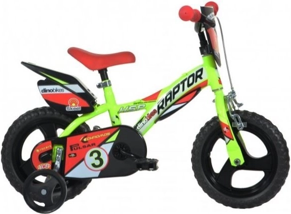 A Dino Bikes Raptor gyermek kerékpár könnyű acélvázzal rendelkezik, amely biztosítja a könnyedséget és tartósságot. 12” acél felnik dróthálóval és EVA habbal töltött gumiabroncsok biztosítják a stabil és biztonságos közlekedést. A kerékpár 2 pofafékes fékkel van ellátva a megbízható megálláshoz és láncvédővel a nagyobb biztonság érdekében.
