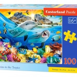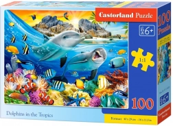 A DELPHINS IN THE TROPICS motívumú puzzle a kikapcsolódás, az esztétikum és a készségfejlesztés kombinációját kínálja. A 100 erős darabnak köszönhetően ideális olyan gyerekeknek, akiknek már van némi tapasztalatuk a kirakózással, valamint felnőtteknek, akik egy kellemes, nyugodt elfoglaltságot keresnek. A 40 × 29 cm-es kész kép remekül mutat a gyerekszobában.