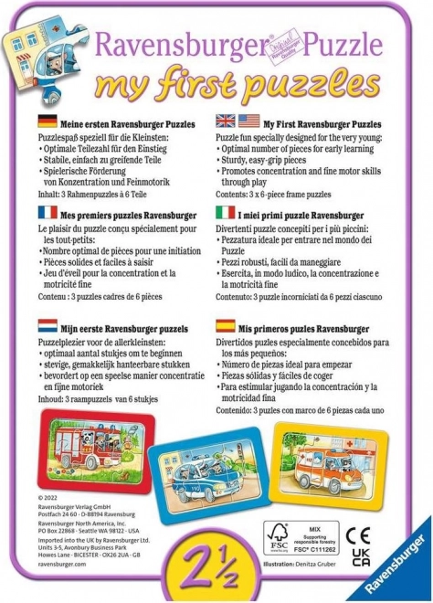 Fedezd fel az első kirakók örömét ezekkel a RAVENSBURGER gyerekpuzzle-ökkel. A szett három, egyenként hat darabból álló képet tartalmaz, extra vastag kartonból készült elemekkel a kis kezek számára. Fejleszti a finommotorikát, a koncentrációt és a képzeletet, és elbűvöl a cuki bevetési járművekkel, amelyeknél állatok ülnek a volánnál.