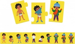 A Djeco gyerek puzzle játékosan mutatja be az öltözködési folyamatot. Nagy és erős darabokat tartalmaz, amelyek ideálisak kisgyerek kezek számára.