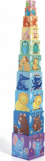 A DJECO közkedvelt doboztornya az állatanyákat és kölykeiket ábrázoló illusztrációkkal. A gyerekek akár 89 cm magasra is építhetnek, ledönthetik, majd egymásba tehetik a kockákat, miközben természetes módon tanulják a színeket, formákat és az első számolást, valamint fejlesztik a finommotorikát. A készlet 10 kockát tartalmaz, órákon át tartó szórakozáshoz.