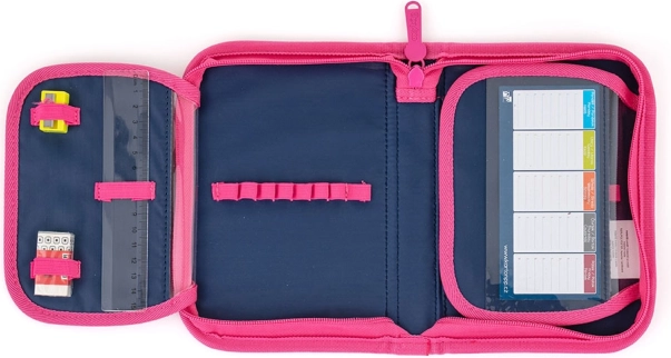 Tolltartó egyszintes, gumipántokkal rendelkezik az íróeszközök rögzítésére, és átlátszó fóliával van ellátva az órarendhez, ami megkönnyíti az iskolai kellékek szervezését.
