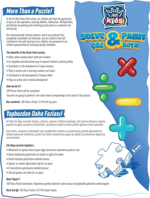 A puzzle az alapvető matematikai elvek, mint a összeadás, kivonás, szorzás és osztás tanulására irányul, ami hozzájárul a matematikai képességek fejlődéséhez felesleges szorongás nélkül. A színezésnek és a kirakásnak köszönhetően a gyerekek javíthatják kézügyességüket és fejleszthetik vizuális memóriájukat.