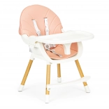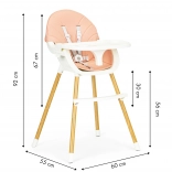 Az univerzális ECOTOYS 2 az 1-ben etetőszék együtt nő gyermekével. A könnyen eltávolítható lábaknak és lábtartónak köszönhetően pillanatok alatt átalakítható magas etetőszékből alacsony székké önálló evéshez, rajzoláshoz vagy játékhoz. A praktikus, 3 fokozatban állítható tálca megemelt peremmel segít rendben tartani az étkezéseket.