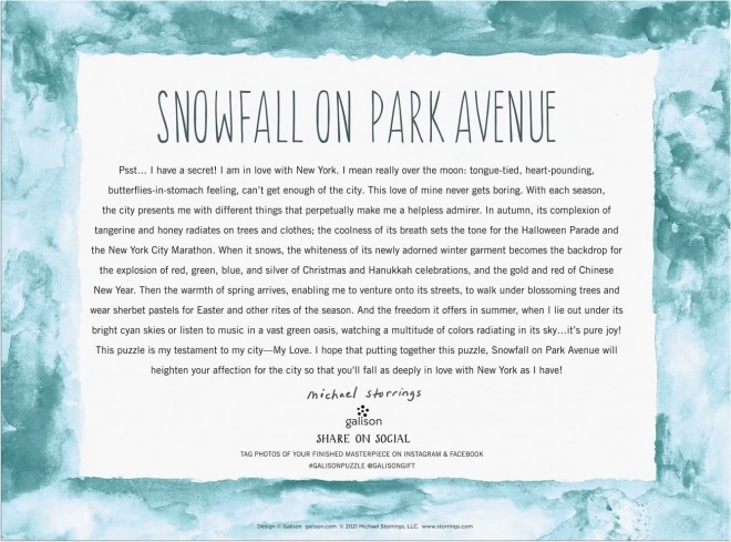 Érezze a Park Avenue havas, különleges varázsát ezzel a részletesen kidolgozott puzzle-el. Találkozzon egy idillikus jelenettel, amely egyenesen a filmekből ismert téli romantika szívébe repíti Önt.