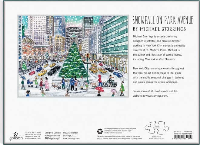 Élvezze a téli New York varázslatos hangulatát a Hóvihar a Park Avenue-n című puzzle segítségével, amelyet Michael Storrings tervezett, és 1000 darabot tartalmaz. Ideális szórakozás hosszú téli estékre, amely nemcsak a logikáját fejleszti, hanem örömöt is szerez a fenntarthatóan készült termék révén.