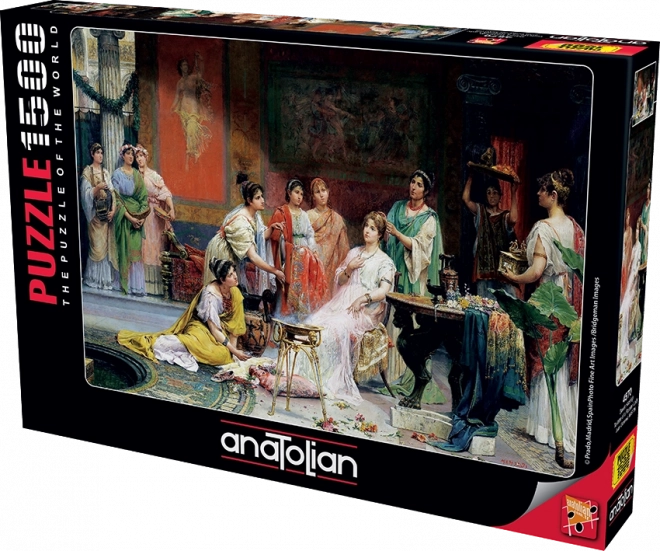 Fedezze fel az antik motívum varázsát az ANATOLIAN – Egy római hölgy toalettje puzzle-lel. A 1500 darab kirakása kellemes kihívást jelent a haladóknak és a türelmes kezdőknek egyaránt, és elkészültével egy kb. 85 × 60 cm-es, impozáns képet kap, amely ideális keretezéshez.