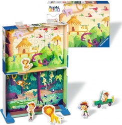 A Ravensburger Puzzle & Play: Dzsungelkaland dupla szórakozást nyújt – először két színes puzzle kirakása (mindegyik 24 darabból), majd bábszínházas játék a mellékelt figurákkal. A doboz két részének összekapcsolásával stabil színpadot hozol létre, amelybe a kirakók háttérként illeszkednek.