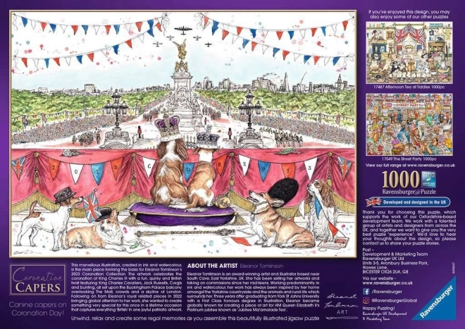 Az elragadó "Coronation Capers" kirakó egyedülálló lehetőséget kínál, hogy otthonod kényelméből éld át a brit királyi hagyományt. Eleanor Tomlinson művésznő alkotása részletgazdag, és bemutatja a King Charles spánieleket, a Jack Russell terriereket, corgikat és más, a koronázással kapcsolatos elemeket.