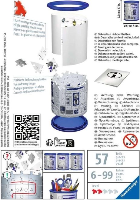 Ne keresse tovább a ceruzákat az asztalon! Ez a RAVENSBURGER 3D puzzle tartó Star Wars praktikus és egyben szórakoztató formája a szervezésnek. Összerakható a minta szerint a nehezebb kihívásokért vagy a darabok hátulján lévő számsorrendet követve. A speciális hajlított, kiváló minőségű műanyag darabok miatt ez a tartó nemcsak szép designnel, hanem erős stabilitással is rendelkezik ragasztás nélkül.