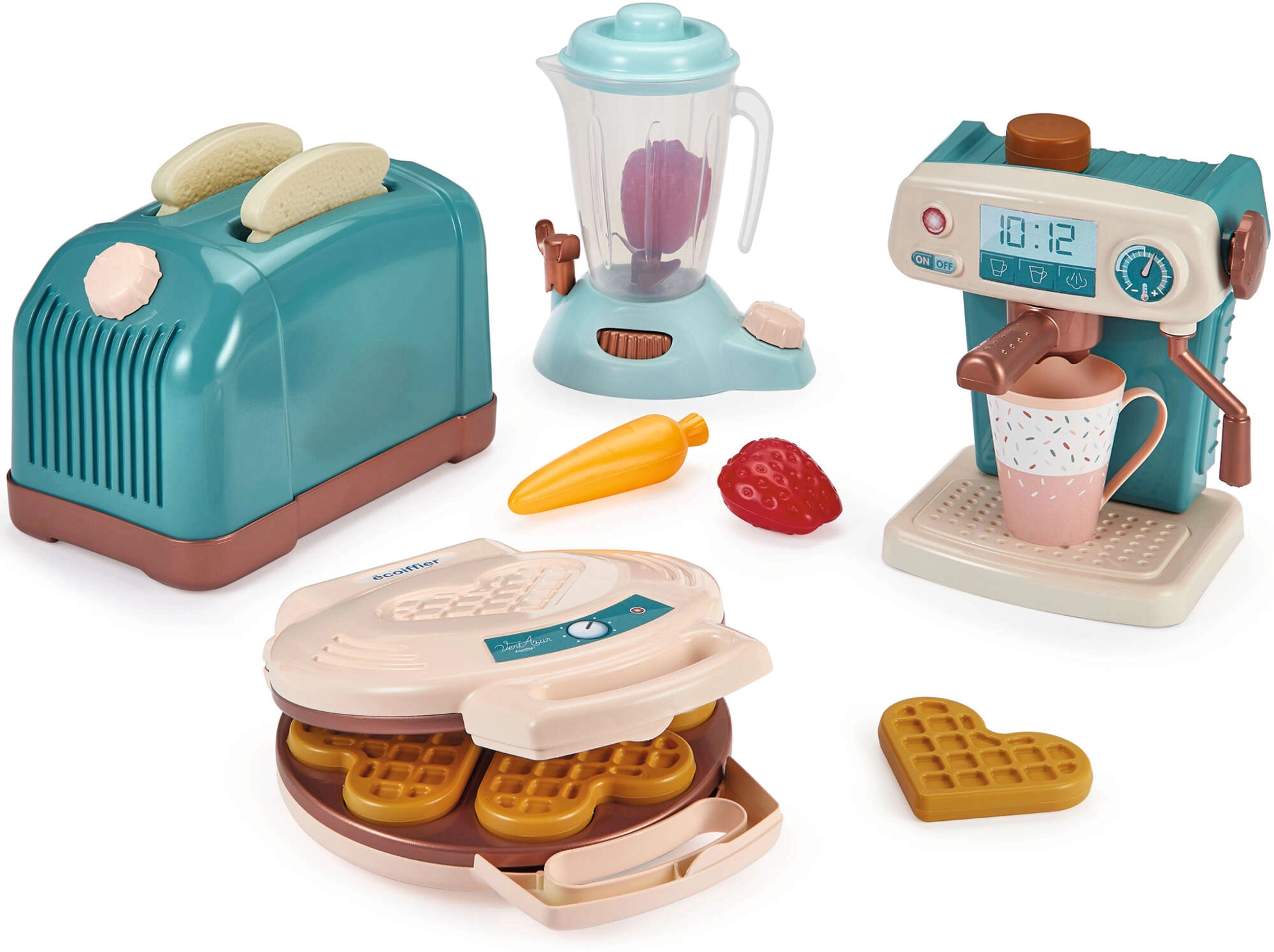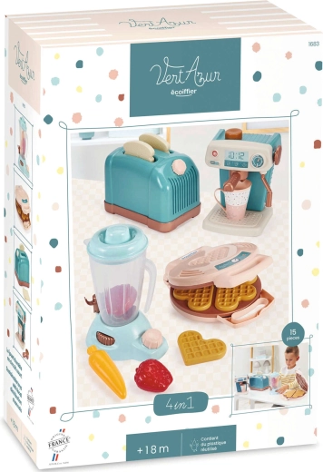 Fedezd fel a főzés kreatív világát az ECOIFFIER Vert Azur gyermek konyhai készlettel – kenyérpirító, kávéfőző, gofrisütő és turmixgép, kiegészítve 15 darab tartozékkal. A készlet fejleszti a képzeletet, a finommotorikát és a szerepjátékot, mozgatható elemekkel rendelkezik, és minőségi műanyagból készült modern kék-barna színvilággal.