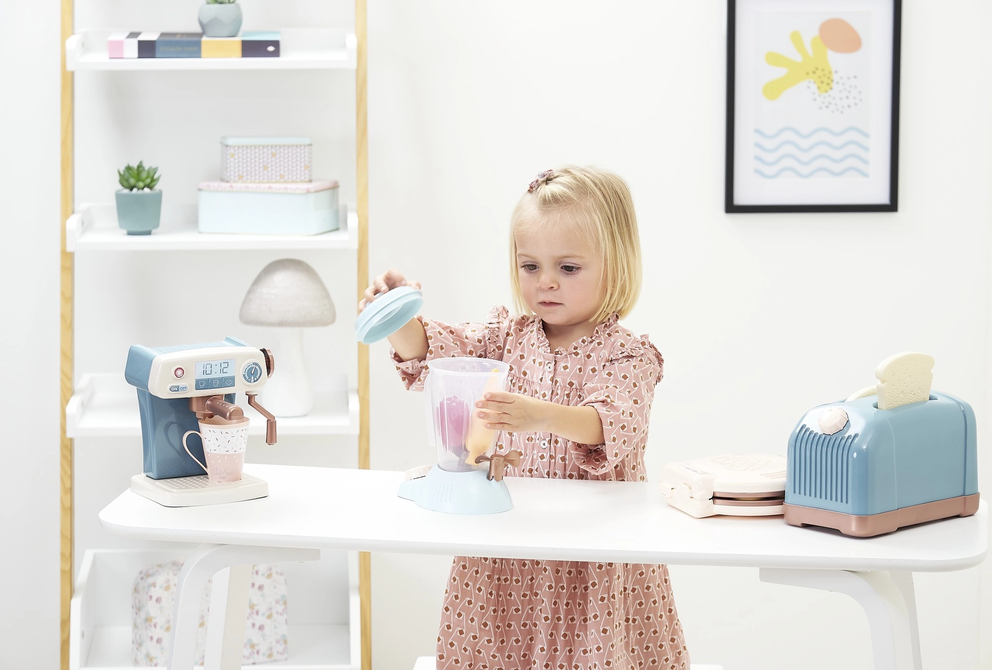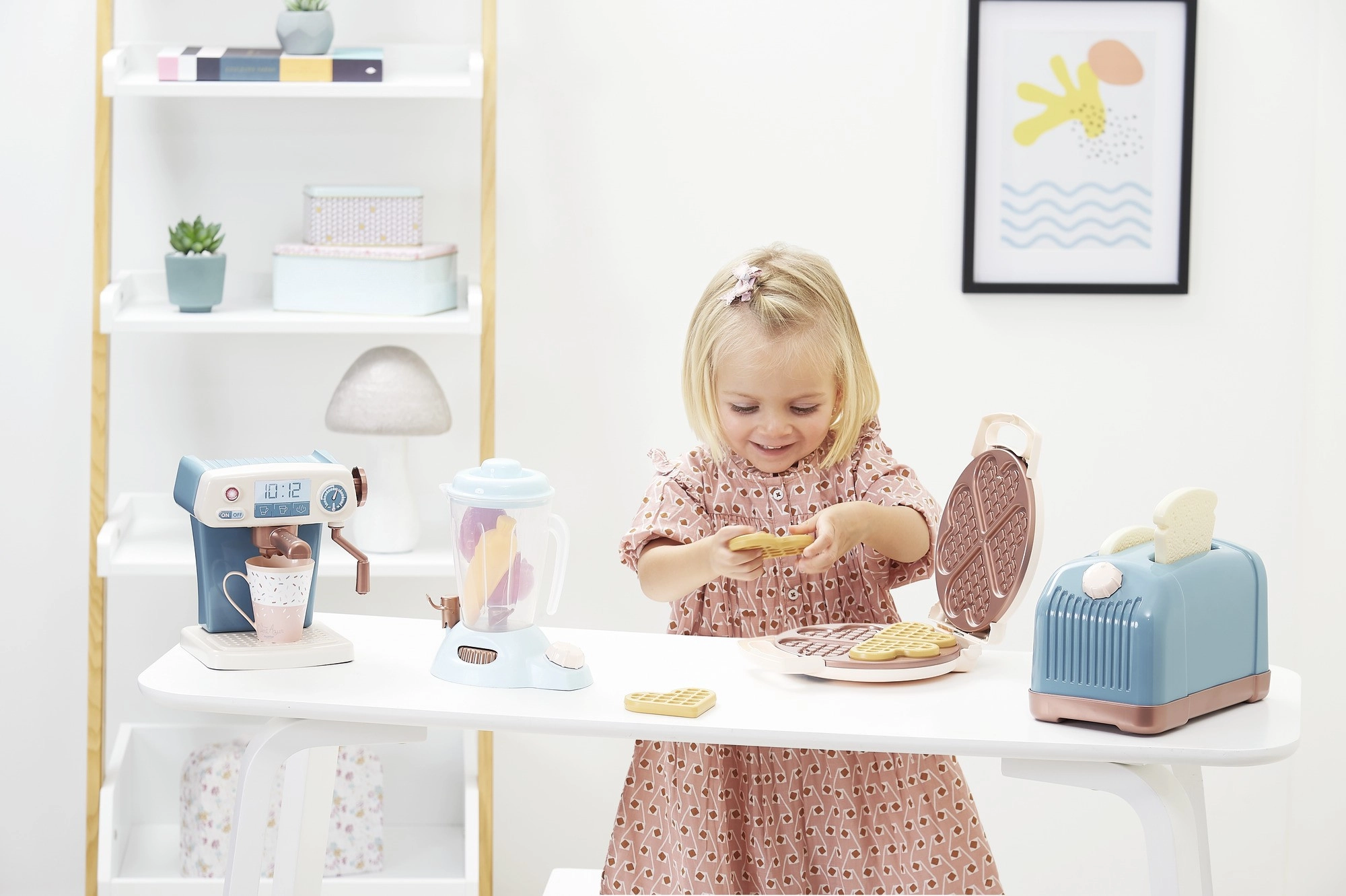 Ez a stílusos készlet mindent elhoz a kis szakácsoknak, amire szükségük van a felnőttek konyhai tevékenységeinek utánzásához. A „pirítóssal” ellátott kenyérpirító, az élethű kávéfőző, a bájos gofrisütő és az átlátszó turmixgép játékos „főzésre”, tálalásra és közös étkezésre hív. Fejleszti a figyelmet, a logikus gondolkodást és a szem–kéz koordinációt.