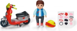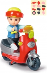 A piros robogót játékos részletek, egy sárga sisak és egy matricalap egészíti ki, így a gyerekek a felszerelést pontosan a saját fantáziájuk szerint díszíthetik.