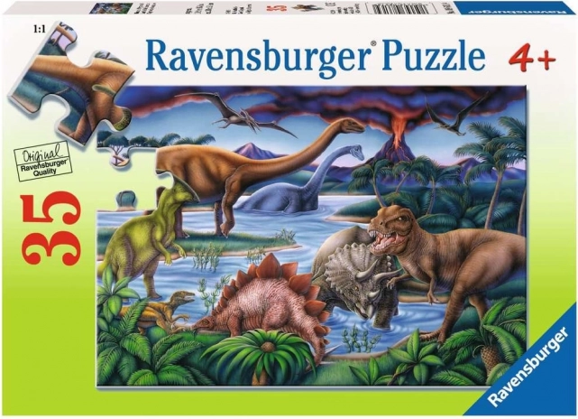 A Ravensburger „Dinosaur Playground” puzzle szórakoztató és oktató tevékenységet nyújt a gyerekeknek. Összerakás után egy jelenet rajzolódik ki T-Rexszel, sztégoszaurusszal és triceratopsszal a vízparton, ami elbűvöli a kis őstörténelem-rajongókat.