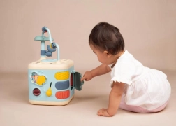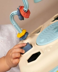 A gyöngylabirintus, a forgó elemek és a fogaskerekek fejlesztik a szem–kéz koordinációt, és támogatják a kreatív játékot.