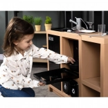 A fa és fekete elemek kombinációja, a praktikus polcok és a szelektív hulladékgyűjtő kosarak rendre és környezettudatosságra tanítják a gyerekeket.
