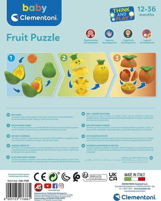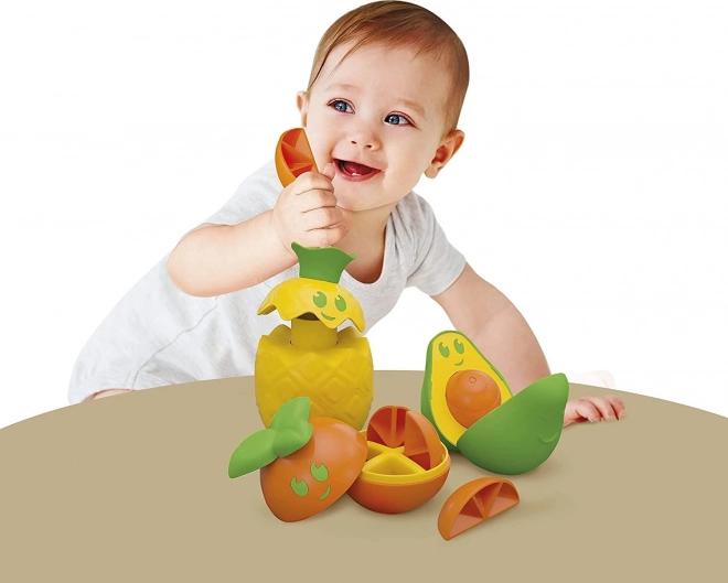 Fedezd fel az okos és fenntartható játékot a CLEMENTONI BABY-vel. A Rakosgatható gyümölcsök szett három kedves gyümölcsöt hoz – avokádót, ananászt és narancsot –, amelyek felfedezésre, válogatásra és építésre ösztönzik a gyerekeket. Minden elem úgy készült, hogy támogassa a logikus gondolkodás, a vizuomotoros koordináció és a tapintási észlelés fejlődését.