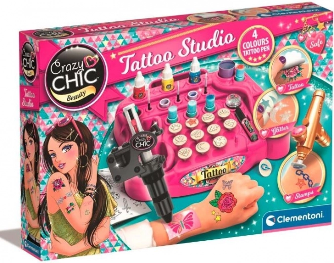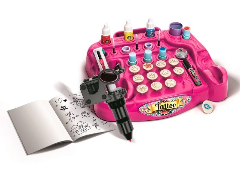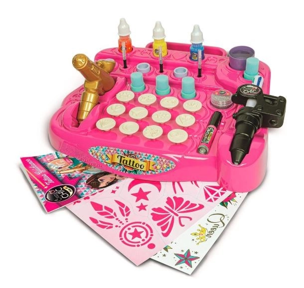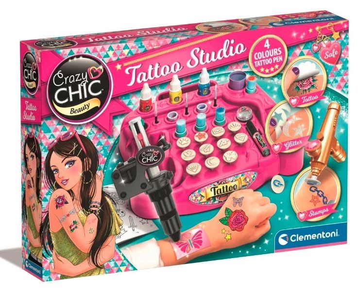 Fedezd fel az ideiglenes tetoválások kreatív világát a CLEMENTONI Crazy Chic készletével – minden egyben a kis stylistoknak. A csomagban két speciális eszköz, eredeti testfilc 4 cserélhető heggyel, sablonok, bélyegzők, csillámok és további kiegészítők találhatók a biztonságos ideiglenes tetoválások készítéséhez. Egyszerű felvitel, különböző technikák és rengeteg motívum a végtelen szórakozáshoz.