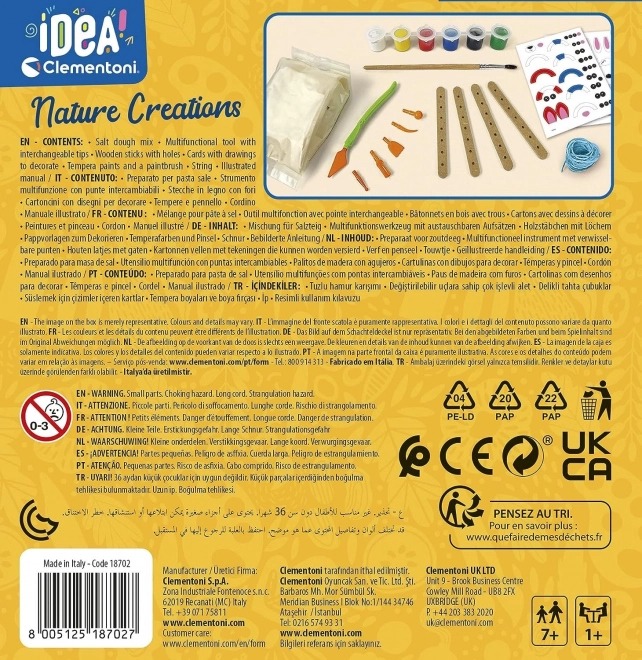 A CLEMENTONI IDEA Természet kreatív készlet mindent tartalmaz, amire a gyerekeknek szükségük van gyönyörű dekorációk készítéséhez sós tésztából. Formázz, szúrd ki, csavard, fesd és díszíts – a fantáziának semmi sem szab határt. A kész alkotások díszíthetik a gyerekszobát, vagy kedves ajándékként szolgálhatnak.