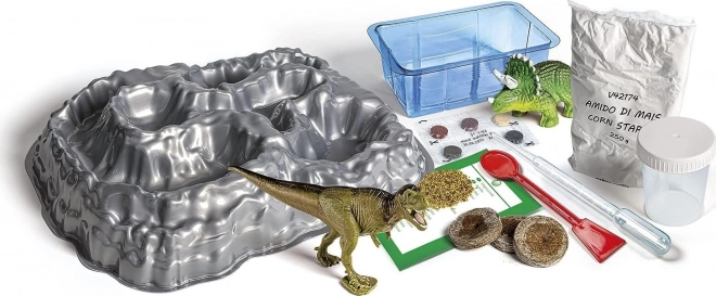 - 2 dinoszaurusz figura (T-Rex, Triceratops), műanyag mocsár, magok, tőzeg, kukoricakeményítő, spatula, mérő pipetta, mérőedény, tálca, színezék, illusztrált magyar nyelvű útmutató