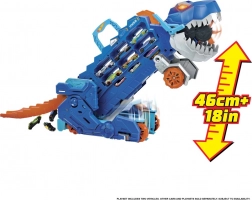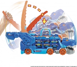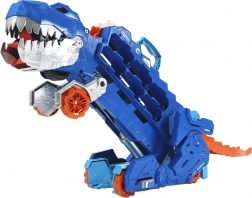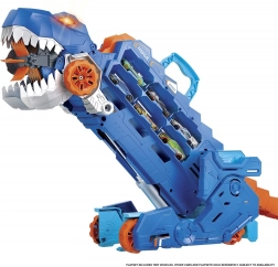 Ez az egyedi dinoszaurusz szállító több mint 20 fém kisautó tárolását ötvözi az akciódús játékkal. Szállító módban elég meghúzni a kart, és figyelni, ahogy a T‑Rex „elnyeli” a kisautókat út közben. Egyetlen farokmozdulattal mechanikus T‑Rexszé alakíthatod fény‑ és dinoszaurusz‑hanghatásokkal.