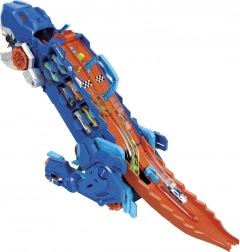 A T‑Rex hátán kétsávos versenypálya vár az izgalmas összecsapásokra. A győztes továbbhalad, míg a vesztest a dínó „kilöki” – ideális a versengő játékhoz. A kisautókat közvetlenül a szájából is kilőheted extra akcióért. A csomagban 2 darab 1:64-es HOT WHEELS kisautó található, így a móka azonnal kezdődhet.