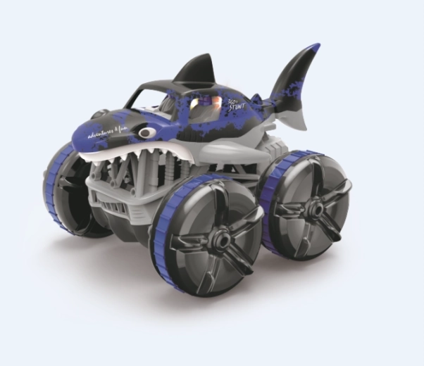 Élvezze a felejthetetlen szórakozást ezzel a **kék színű távirányítós autóval**, amely nem csak a földön, hanem a vízen is magabiztosan közlekedik. Ez a lenyűgöző, minden irányba manőverezni képes jármű a legváltozatosabb terepeken sem mond csődöt. A vezetés közben a fülke színes fényekkel ragyog, míg a vízen haladva a hátsó uszony mozog, mintha egy igazi cápa úszna.
